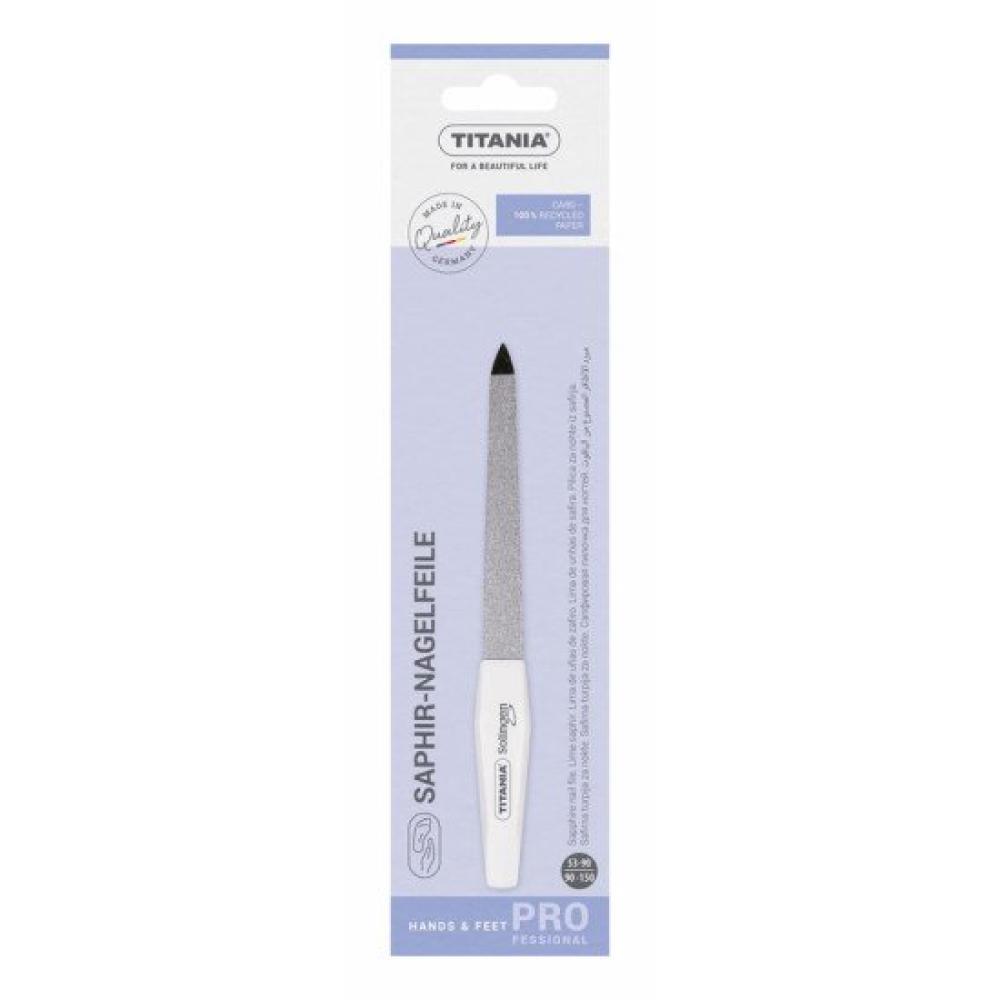 مبرد أظافر تيتانيا مصنوع بمقبض بلاستيكي ومغطى بغبار الياقوت الصغير الدقيق لتوفير المتانة والاستخدام على المدى الطويل.