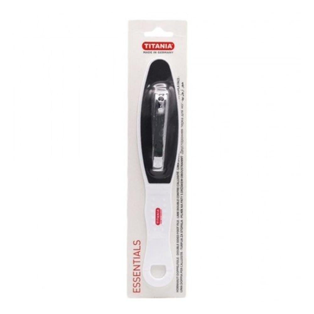تيتانيا مبرد قدم ذو وجهين مع قصافة أظافر:وجه خشن لإزالة الجلد المتكلس والجاف.الوجه الناعم لتنعيم المناطق المزال عنها الجلد المتكلس.مع قصافة أظافر غير قابلة للصدأ.