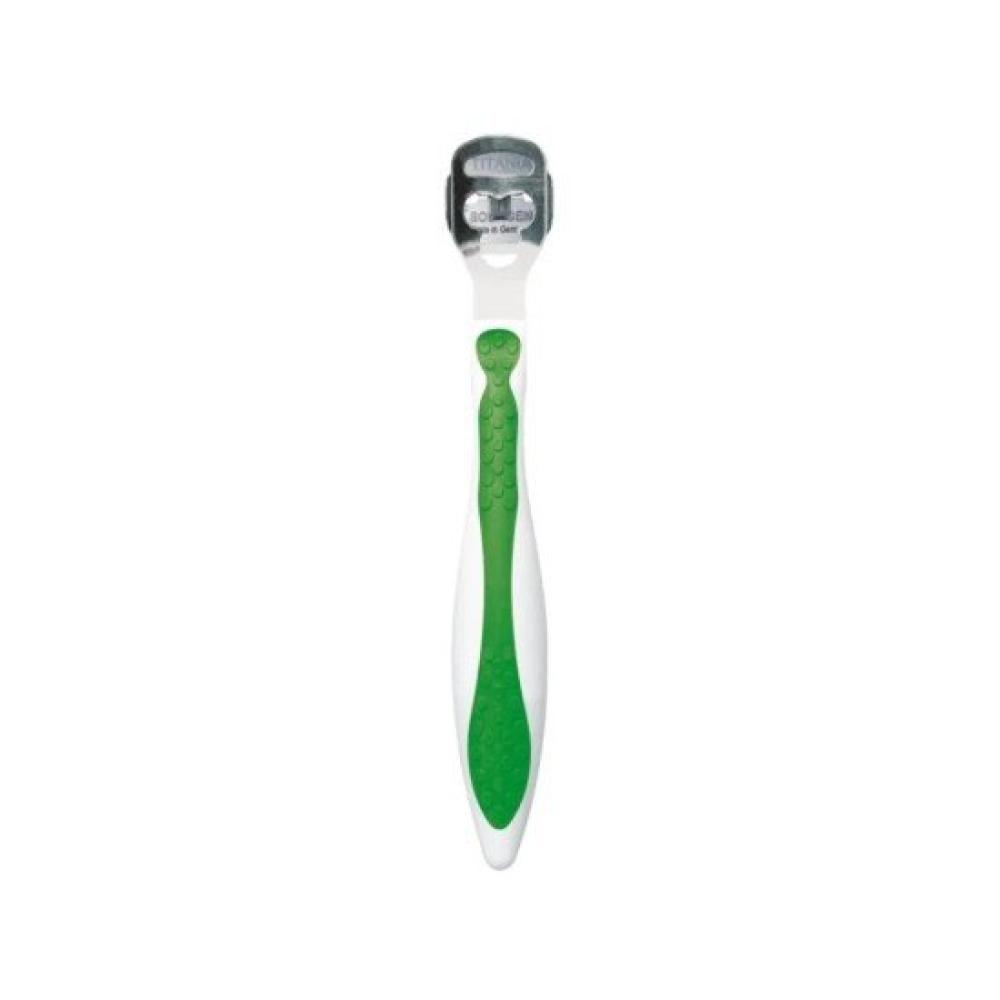 ذو مقبض من المطاط لسهولة التحكم ويحتوى على زوائد تمنع الإنزلاق يتم توجيه المقشط بميل خفيف على الكالو أو الجلد المتكلس المراد التخلص منه ثم يمرر بنعومه حتى يتم إزالة الكالو تماما. يتم إستعمال الموس من الناحيتين وطريقة تغييره سهلة.